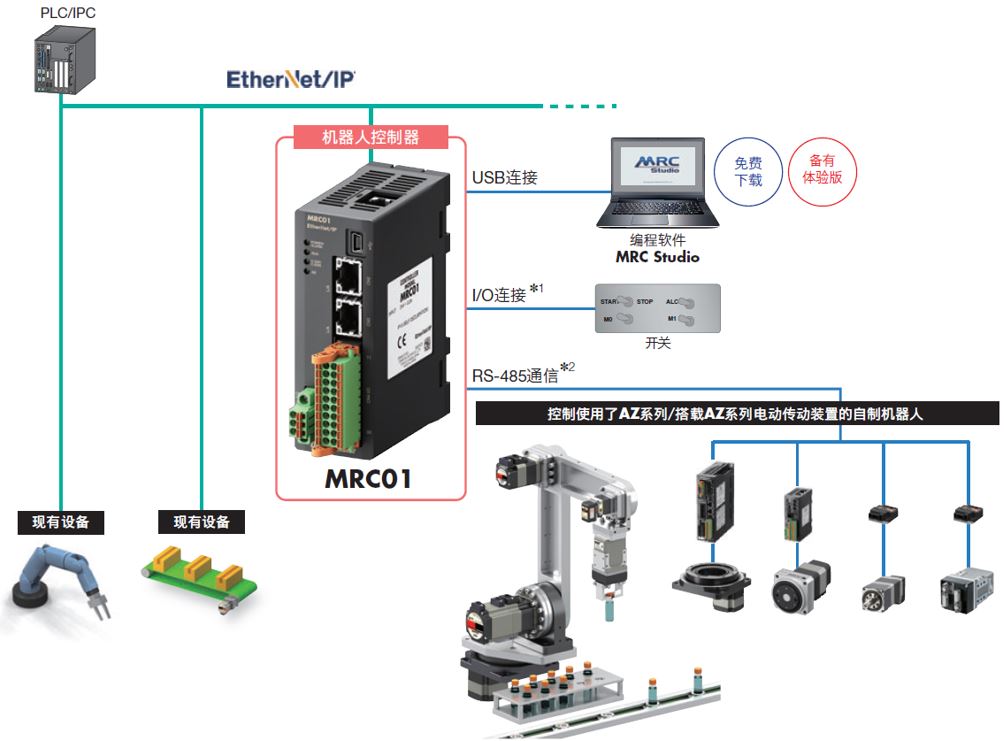 MRC01即使是控制的初學(xué)者,也可簡(jiǎn)單通過開關(guān)的ON/OFF來直接控制運(yùn)行。另外,可以和既有的PLC連接進(jìn)行自動(dòng)運(yùn)行、也可通過連接對(duì)應(yīng)EtherNet/IP?的PLC/IPC、觸摸屏一邊監(jiān)控一邊自動(dòng)運(yùn)行。 機(jī)器人控制器MRC01