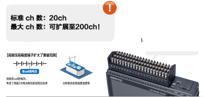 midi LOGGER GL84-0WV C存儲(chǔ)記錄錄儀是一款耐高電壓型記錄儀適用于積層電池包的電壓測定和高精度的溫度測定。標(biāo)配20個(gè)通道,最大可以展到200道,可以同時(shí)采樣電流,溫度,濕度,脈沖,邏輯,壓力等物理信號(hào)。標(biāo)配8G的內(nèi)置,8的內(nèi)置Flash閃存。機(jī)器外接SD卡最大還可以32G存儲(chǔ)空間。采用7寸液晶大屏幕顯示、可以直接在屏幕上顯示實(shí)時(shí)數(shù)據(jù)變化曲線和數(shù)據(jù)列表。記錄數(shù)據(jù)可保存為GBD(graphtec binary data)格式、CSV格式。GBD格式需要用儀器專用軟件進(jìn)行查看,CSV格式可以直接用EXCEL打開。