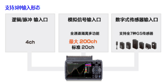 | 支持3種輸入形態(tài)  配備了[模擬信號(hào)輸入(全通道隔離多功能)][邏輯/脈沖輸入][數(shù)字式傳感器輸入口]的3種輸入口、可測量各種各樣的現(xiàn)象。